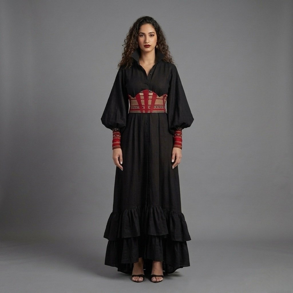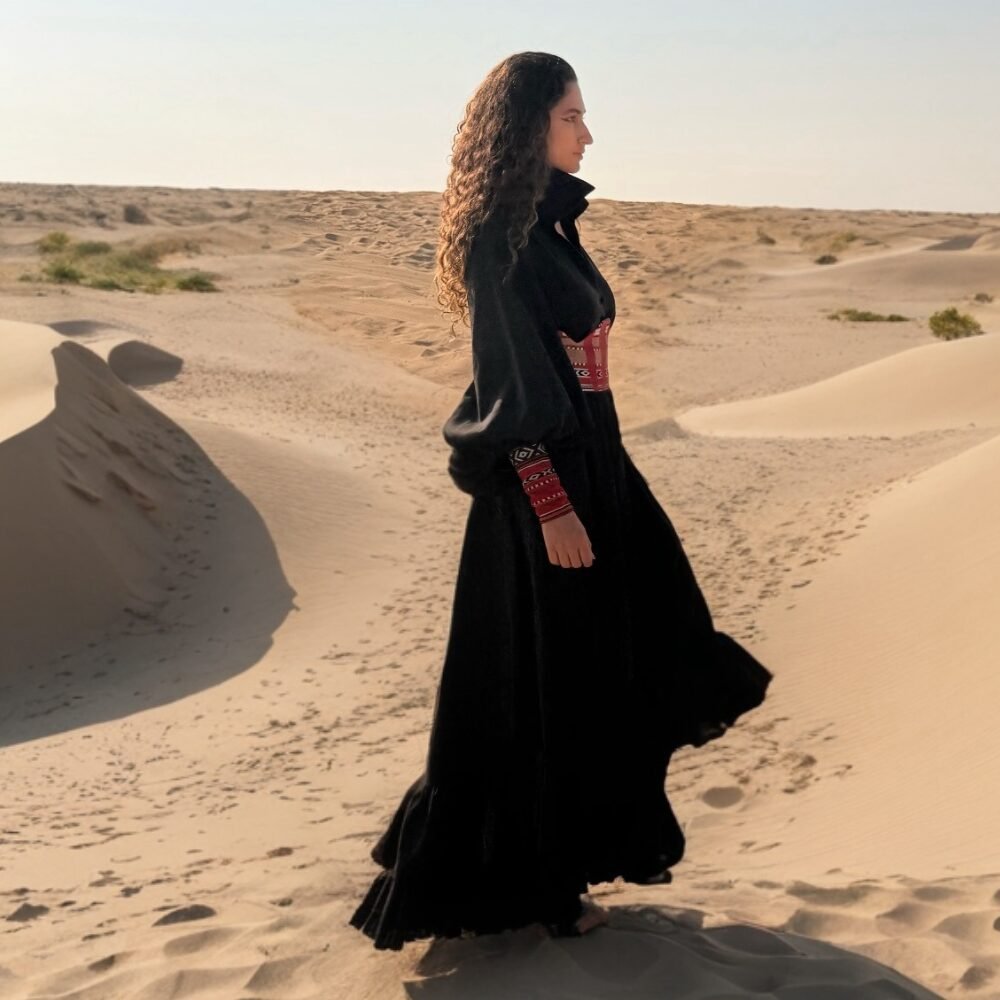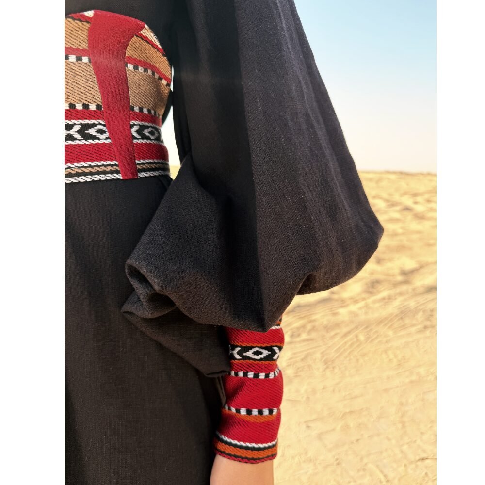 Introducing Qortobiya Kimbaya: a stunning blend of abaya and kimono styles. Crafted from 100% linen cotton, this elegant piece features graceful balloon sleeves and a culturally inspired Sadu cuff. Adorned with a kortuba belt inspired by the Andalusian arch of Cordoba, the Kimbaya offers a unique and sophisticated touch to any outfit. Perfect for both special occasions and everyday wear, this garment beautifully merges tradition with contemporary fashion, making it a must-have in your wardrobe.