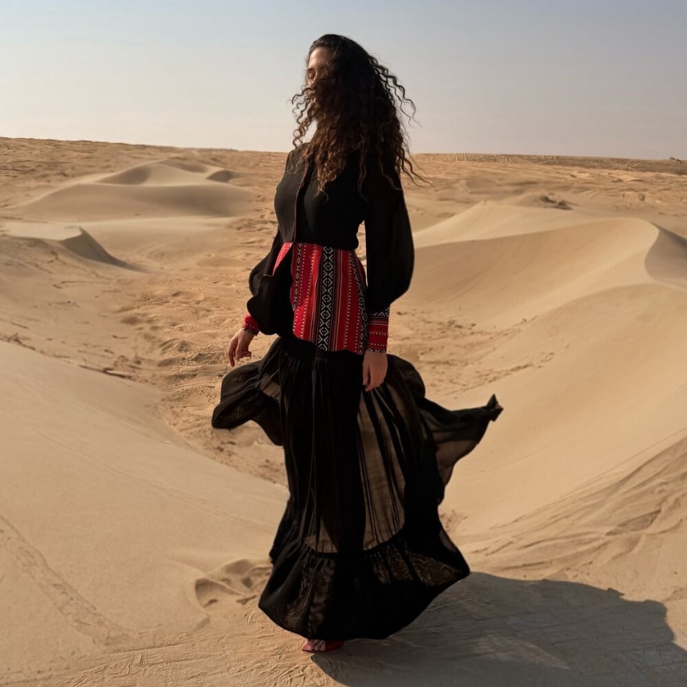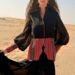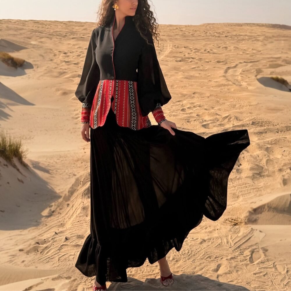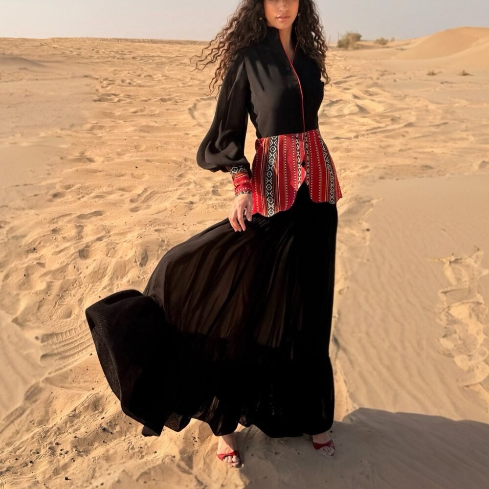 Al Hurqah Blazer is a stunning blend of modernity and tradition, crafted from luxurious crepe and Sadu. Featuring dramatic balloon chiffon sleeves for a chic silhouette, it showcases intricate design elements inspired by the geometrical shapes of the Mosque of Córdoba along its edges with hanging faux pearls. This versatile blazer adds a stylish and sophisticated touch to any outfit, making it perfect for both formal and casual occasions.