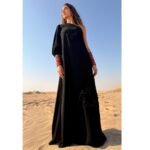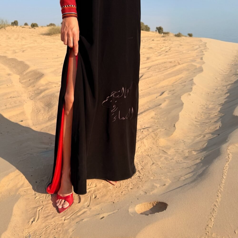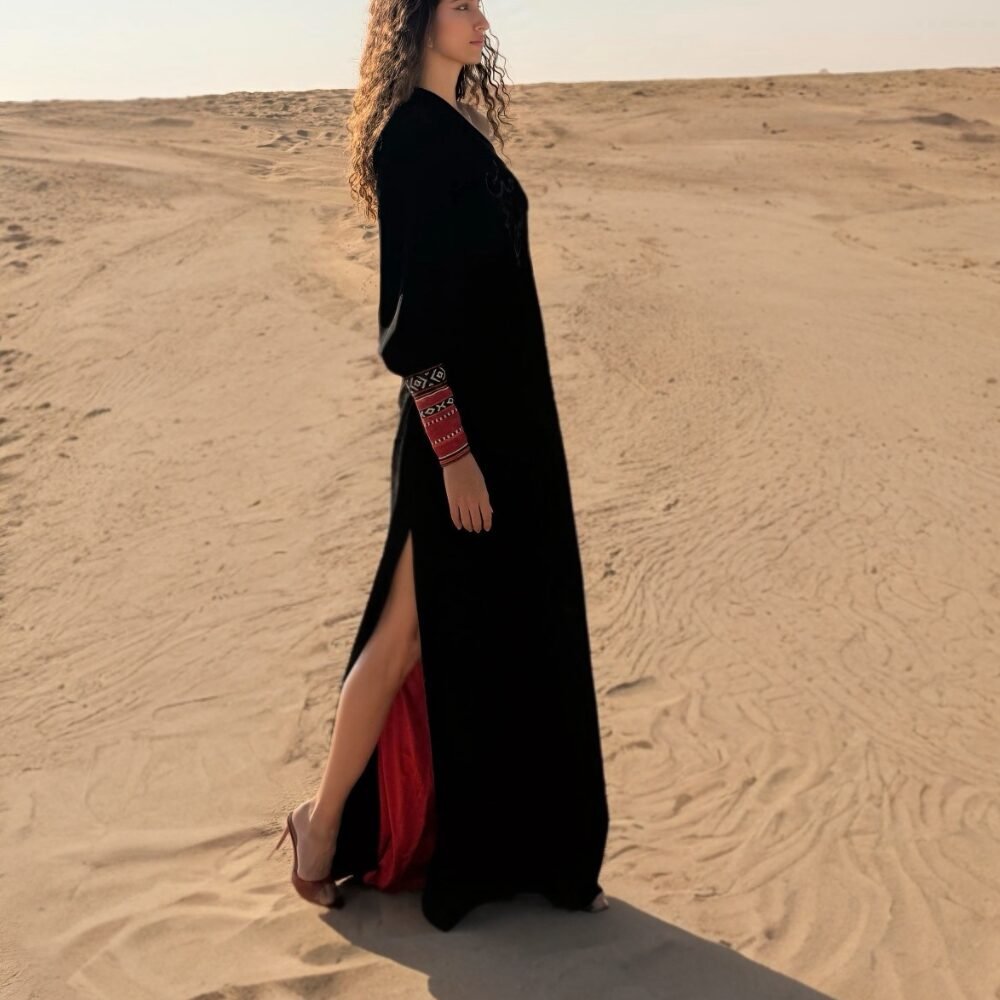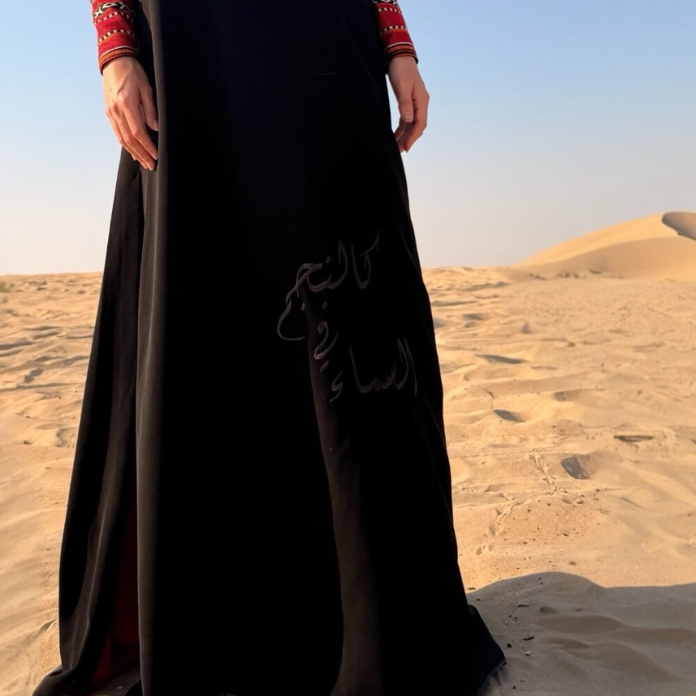 The Al Khansa Kaftan exudes elegance and poetry, crafted from luxurious crepe. Featuring a striking single sleeve adorned with a beautifully designed Sadu cuff, this piece is a true statement of style. It is hand-embroidered with the timeless verse in Arabic: “حبك في قلبي كالنجم في السماء,” paying homage to the beloved poet Al Khansa. This kaftan seamlessly blends tradition with contemporary sophistication.