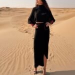 Fariha High neck top, expertly crafted from soft satin crepe. This luxurious piece features elegant balloon chiffon sleeves, beautifully accented with intricate Sadu fabric at the cuffs. The elastic bottom ensures a comfortable fit, making it not only stylish but also practical for everyday wear.