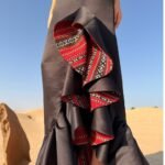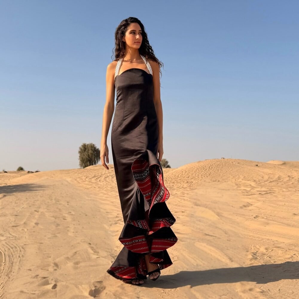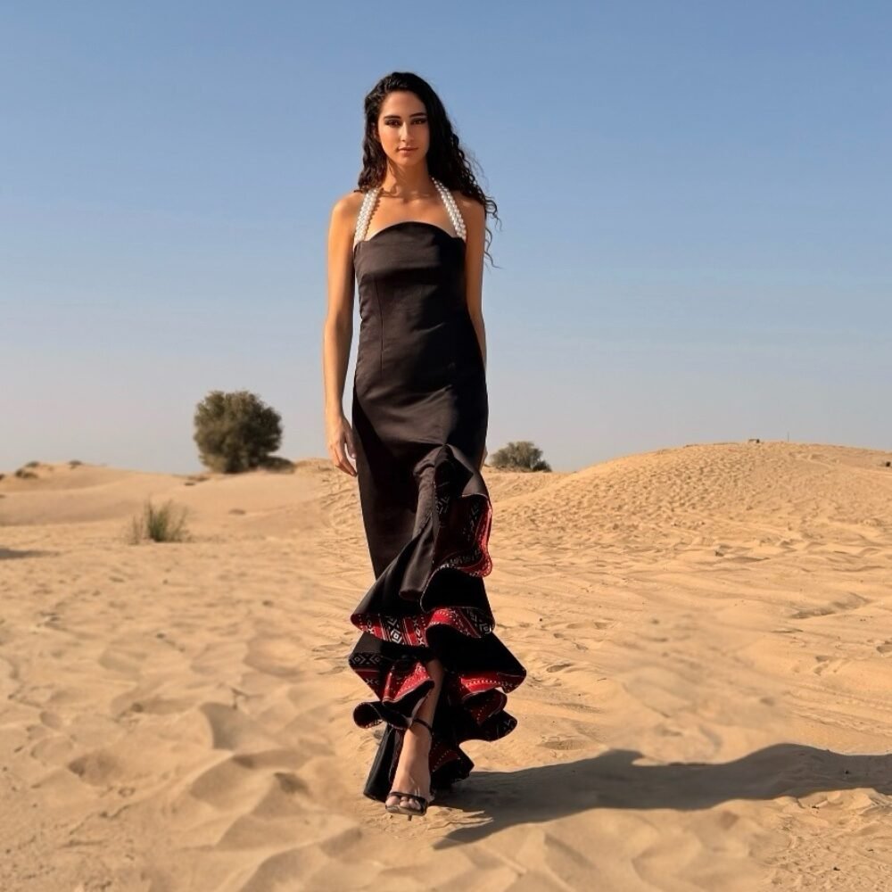 Tumadir Spanish Dress showcases an exquisite oeuvre d’art . The captivating ruffles elegantly blend with the Sadu elements, creating a harmonious fusion of textures and history. Complete with a pearled neckline, this dress adds a glamorous touch, making it a perfect statement piece for any occasion.