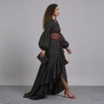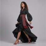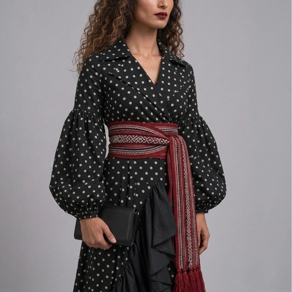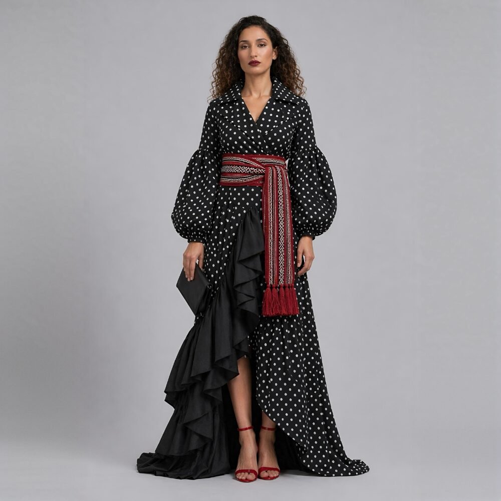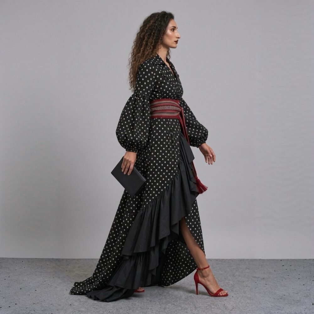 The Qamar dress is a statement of cultural fusion and structural drama. It blends playful polka-dot patterns with voluminous balloon sleeves and cascading ruffles—an homage to the expressive codes of flamenco dressing.