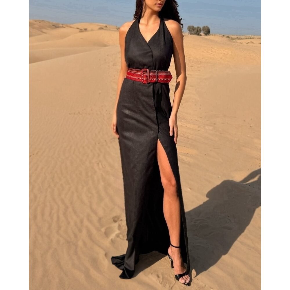 A long dress featuring a front opening and a high neck design, styled as a long vest. It can be elegantly paired with a Sadu belt or a matching fabric belt, crafted from luxurious sheen linen.