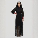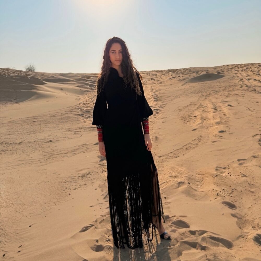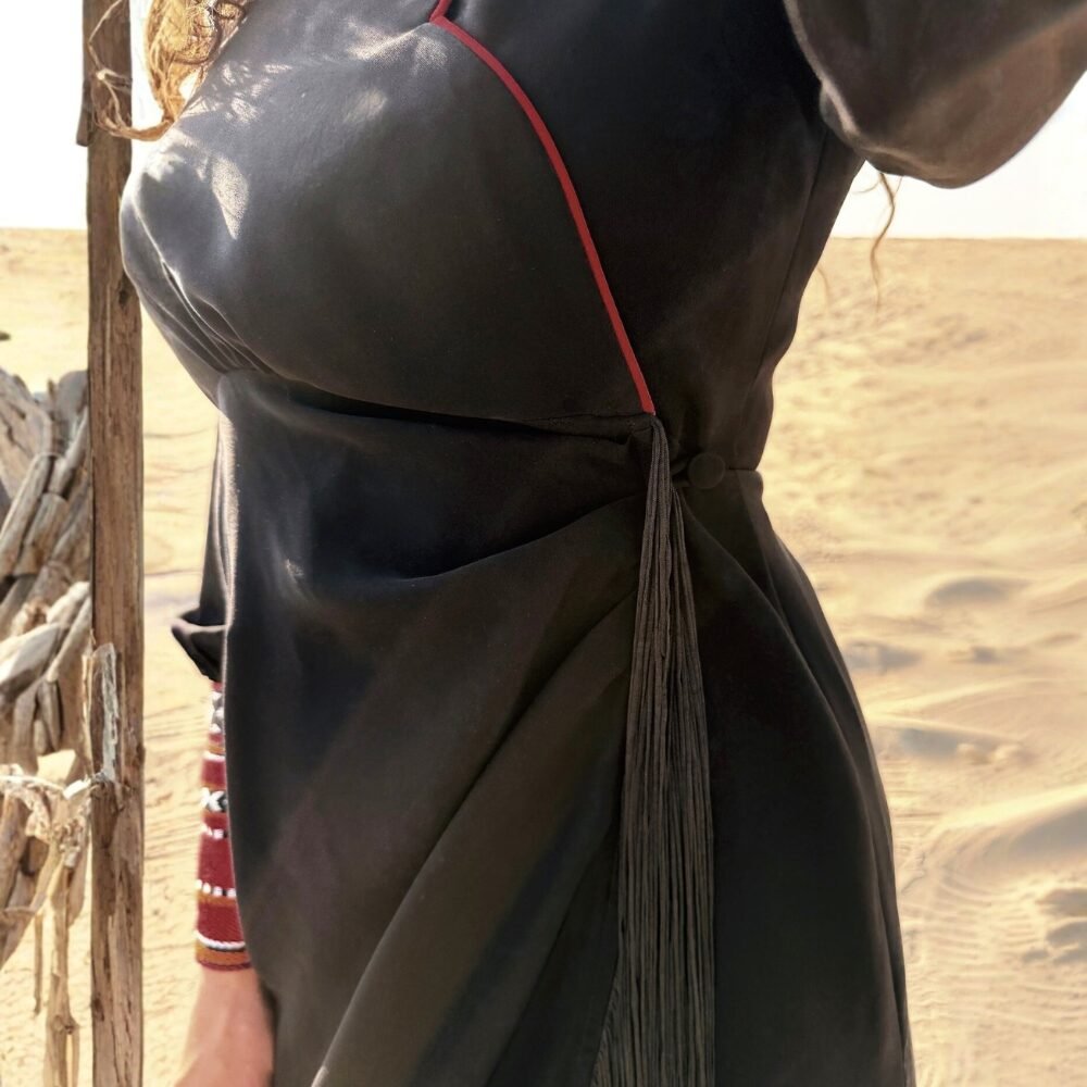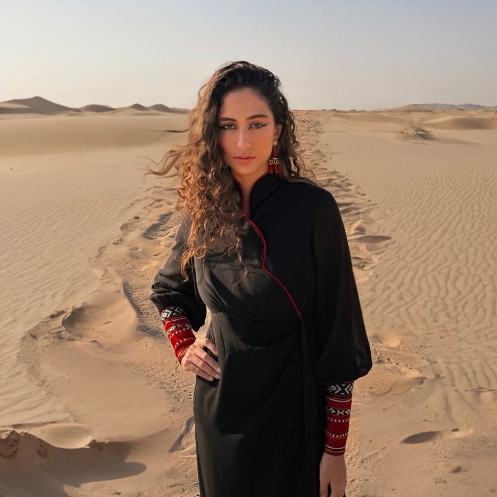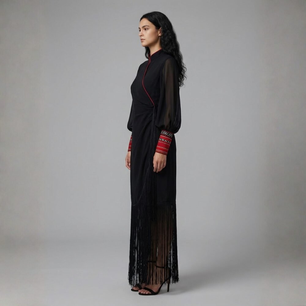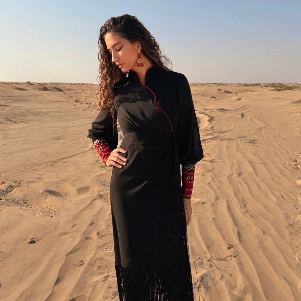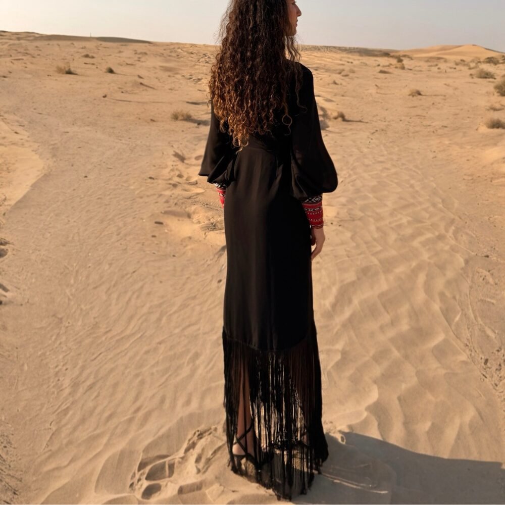 Muriyya wrapping dressThe Al Muriyya Wrapping Dress exudes class and sophistication, crafted from premium crepe for a luxurious feel. Its elegant design features playful tassels that create graceful movement, while the Sadu cuffs add a unique fusion of traditional artistry. This dress is perfect for those seeking a striking balance between modern style and cultural heritage.